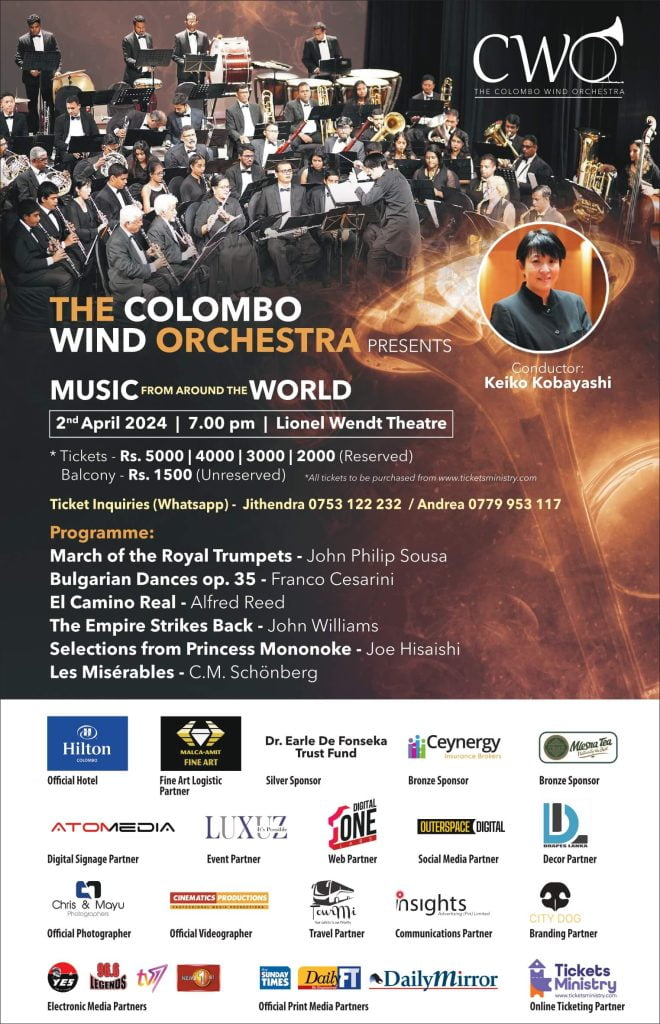 On the 2nd of April, 2024, music enthusiasts gathered at the iconic Lionel Wendt Theatre for an unforgettable evening as The Colombo Wind Orchestra presented “Music From Around the World.” Under the expert direction of the renowned conductor, Keiko Kobayashi, the audience was treated to a spectacular performance that took them on a musical journey across the globe.